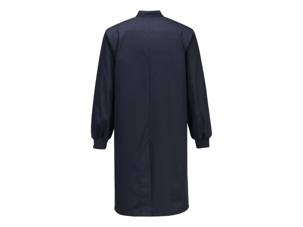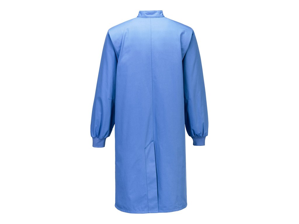 Lehký antistatický ESD plášť s kapsami, náplety na rukávech a povrchovou úpravou odpuzující vodu a nečistoty.