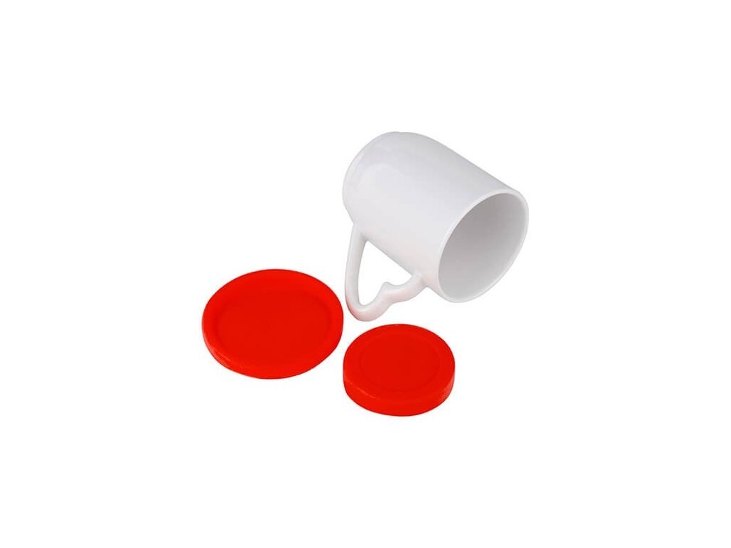 Bílý hrnek s uchem ve tvaru srdce a červeným silikonovým víčkem a podšálkem o objemu 360 ml, potisk vlastním obrázkem nebo fotografií, vhodný dárek k Valentýnu.