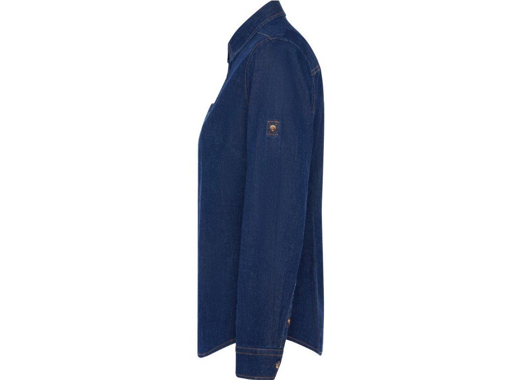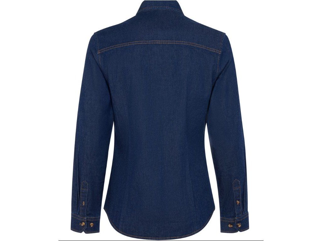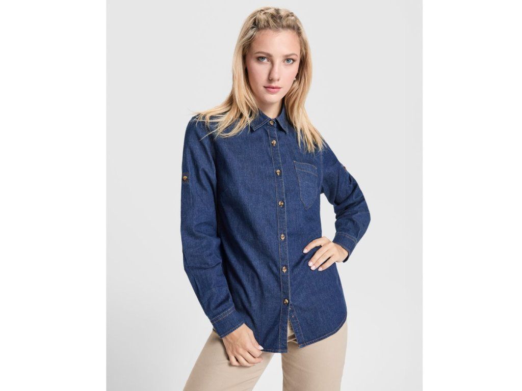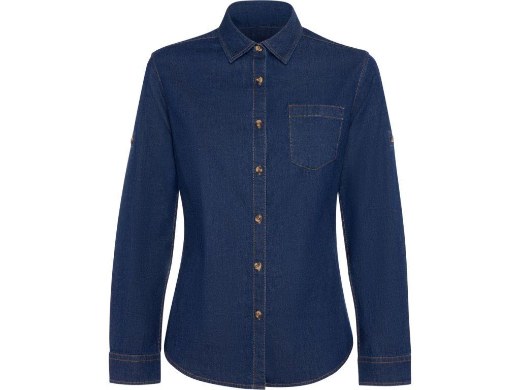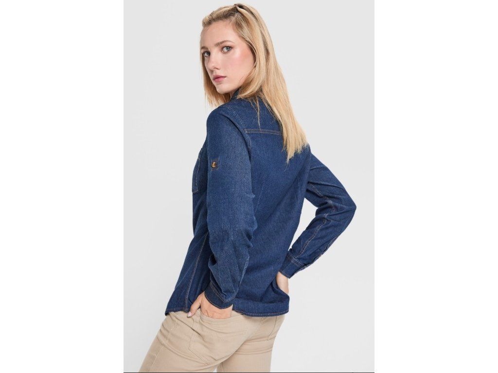 Dámská džínová košile Lujan s dlouhým rukávem ze strečového džínového materiálu s tvarovaným střihem, límcem a V kapsou na hrudi. Pohodlná a stylová volba pro každodenní nošení i pracovní prostředí.