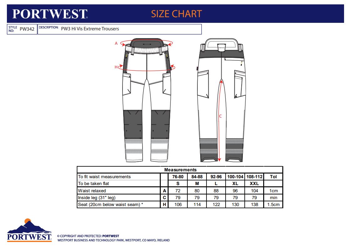 Vyrobeny z odolné tkaniny Portwest Extreme (100 % polyester, 300D Stretch Oxford) s PU membránou, vodním sloupcem 11 000 mm a prodyšností 50 000 g/m²/24 h.