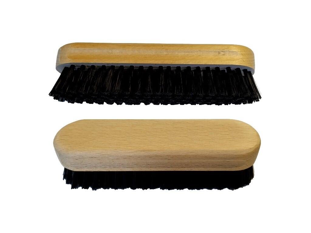 Kvalitní kartáč na obuv s dřevěným tělem z bukového dřeva a odolnými syntetickými štětinami. Praktický pomocník pro běžnou údržbu a leštění obuvi doma i na pracovišti.