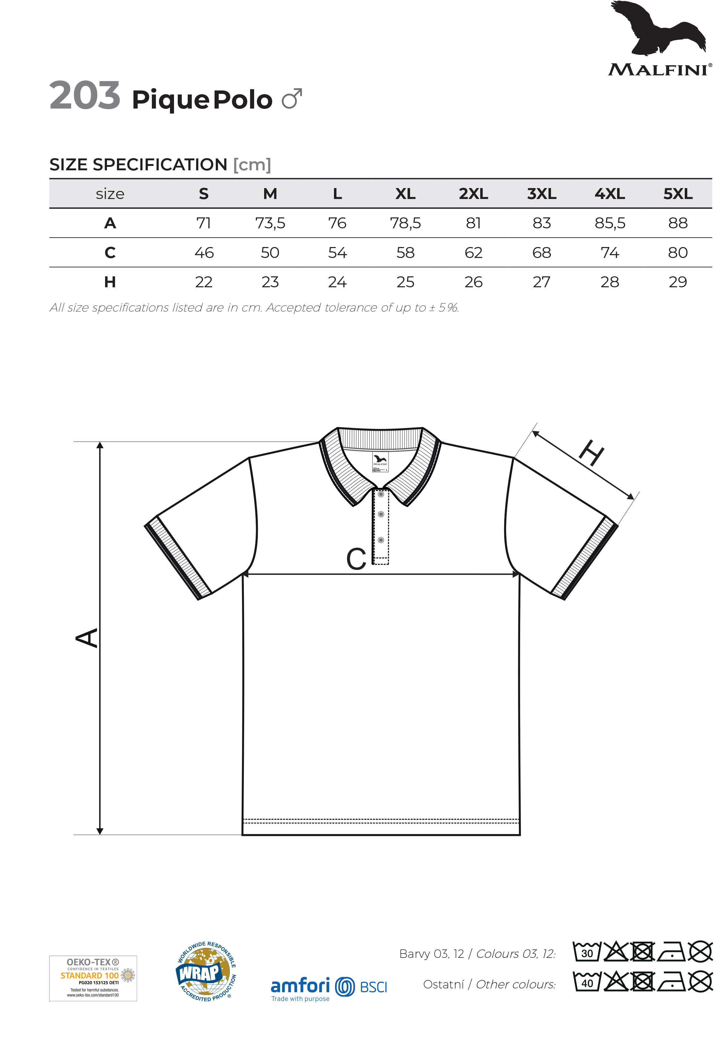 - Pique, 65 % bavlna, 35 % polyester (složení se může lišit - barva 03 - 97 % bavlna a 3 % viskóza, barva 12 - 85 % bavlna, 15 % viskóza) 200 g/m²
