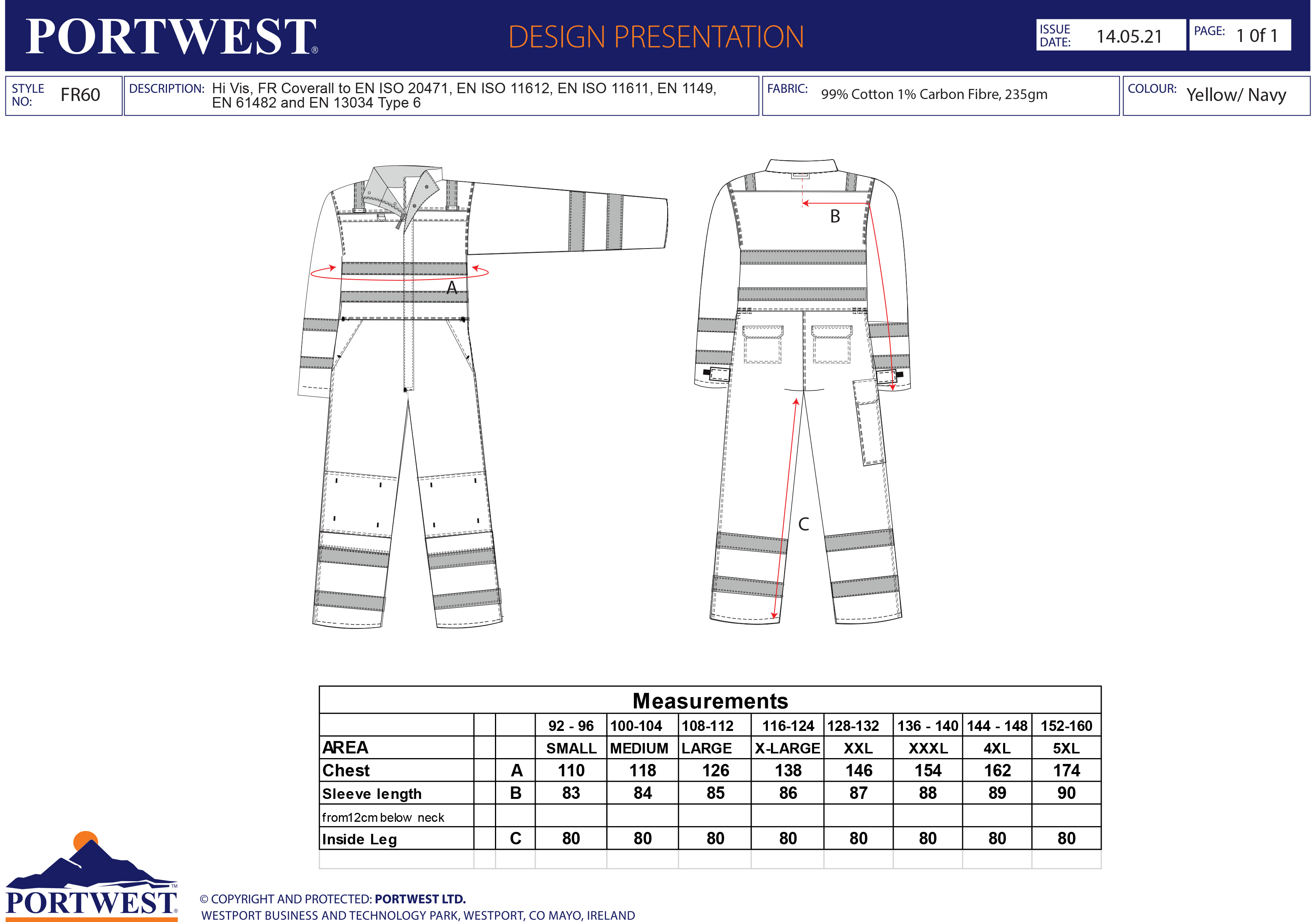 Kombinéza vyrobená s reflexními pruhy pro větší viditelnost nehořlavá s plnou příslušnou certifikací. Tento pohodlný oděv poskytuje ochranu proti více rizikům včetně vystavení teplu ohni chemikáliím elektrickému oblouku a svařování. Dvojité prošití Hi-Vis pruhy na hrudníku horních a dolních končetinách krytý mosazný dvoucestný zip dvě kryté přední kapsy na hrudi kryté boční kapsy zadní kapsy a kapsu na metr. Tento oděv má také patentované kapsy kolenní vložky.