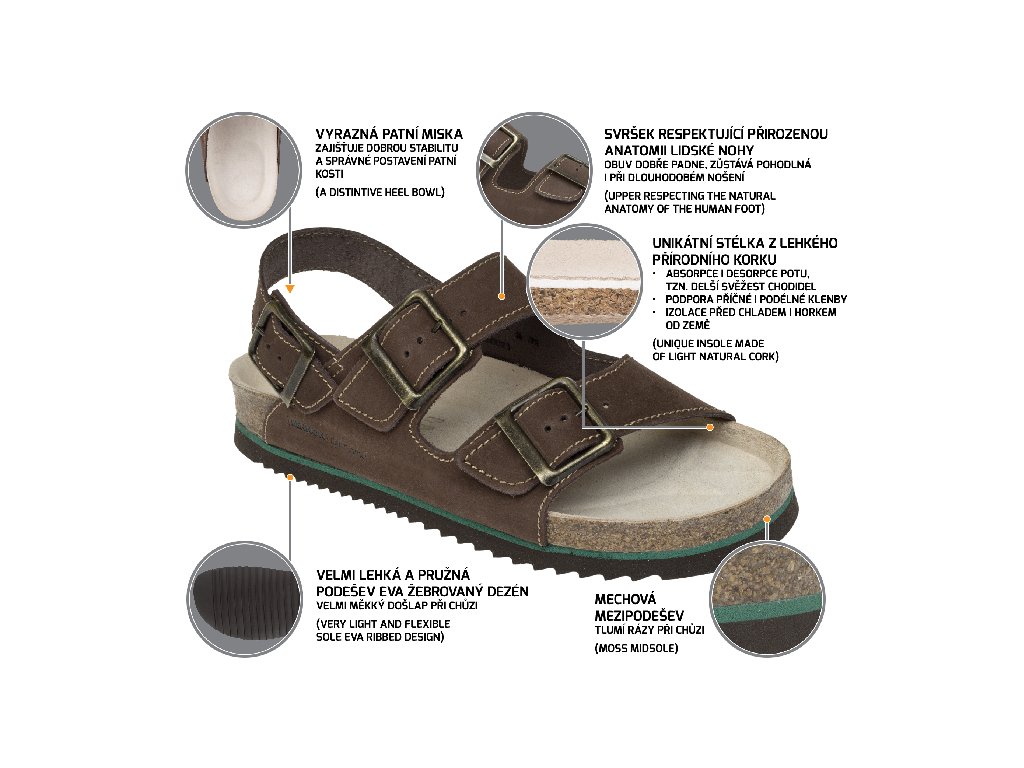 Anatomicky tvarovaná platforma podporuje příčnou i podélnou klenbu nožní a díky výrazné patní misce zajišťuje i dobrou stabilitu postavení patní kosti. Izolační vlastnosti korku výborně chrání chodidlo před horkem i chladem odspodu. Usňová stélka zajišťuje vysokou absorpci i desorpci potu a tím sucho a pohodlí při nošení. Mechová mezipodešev účinně tlumí rázy při chůzi. Podešev z lehčeného EVA přispívá k nízké hmotnosti a vyšší odolnosti proti oděru a opakovanému ohybu. Ideální pro celodenní nošení.