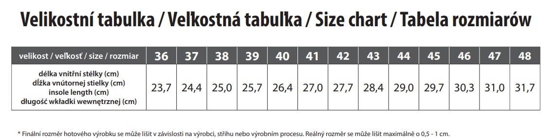 | Velikost | 36 | 37 | 38 | 39 | 40 | 41 | 42 | 43 | 44 | 45 | 46 | 47 | 48 |