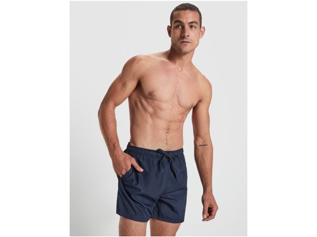 Elastický pas s plochým stahovacím provázkem a kovovými průchodkami ladícími s barvou plavek zajišťuje spolehlivé přizpůsobení obvodu pasu. Boční rozparky umožňují volný pohyb při plavání i chůzi po pláži.
