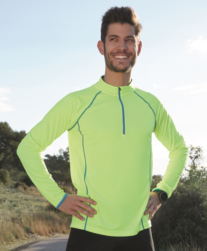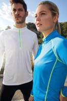 Tričko je doplněno praktickým stojáčkem se zipem a ochranou brady, raglánovými rukávy pro lepší volnost pohybu a plochými švy, které minimalizují podráždění pokožky. Kontrastní detaily na límci, manžetách a švech dodávají moderní sportovní vzhled.