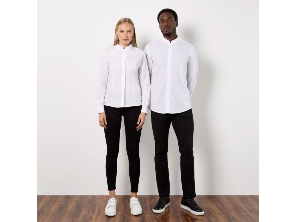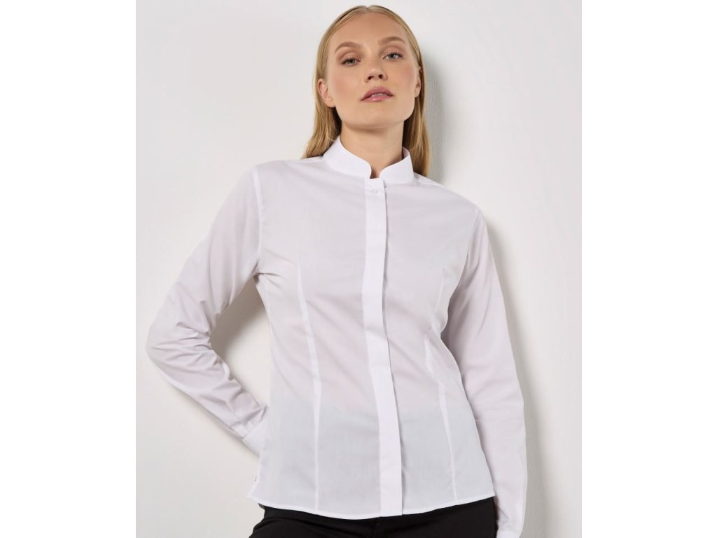 Mandarín límeček, skrytá knoflíková léga a zaoblený lem dodávají halence čistý a elegantní vzhled. Nastavitelné manžety a záševky na přední i zadní straně zajišťují lepší padnutí a vyšší pohodlí při nošení.