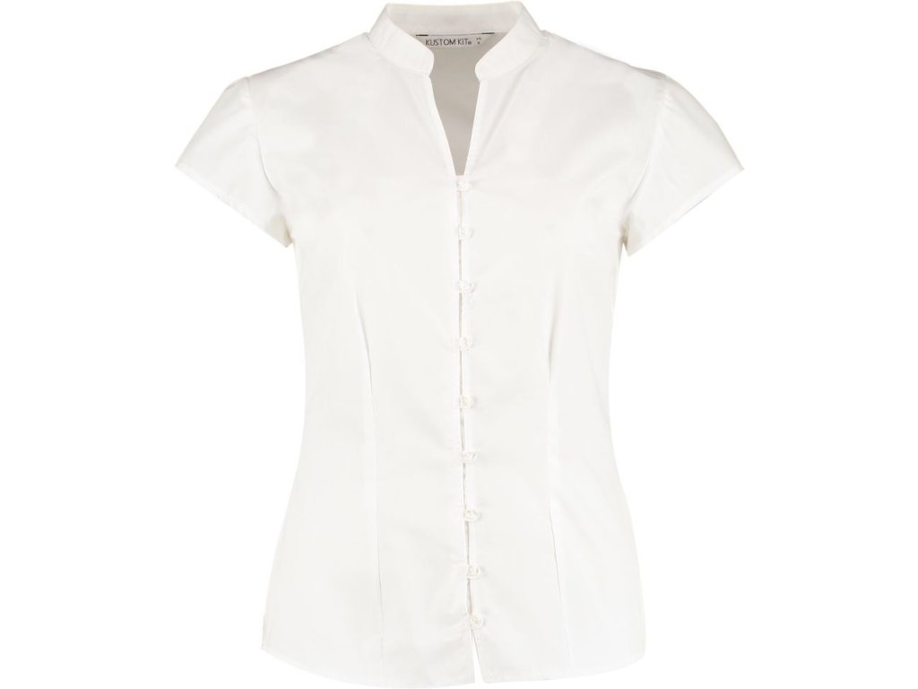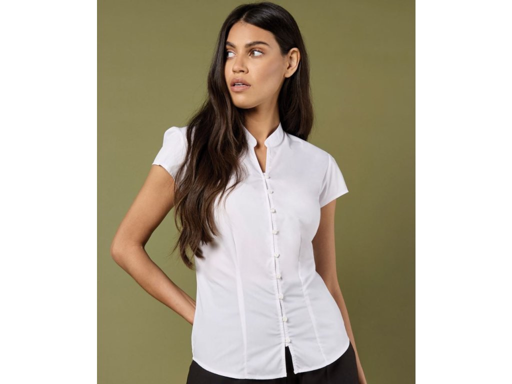 Lehká popelínová halenka s mao límcem a vypasovaným střihem. Elegantní, pohodlná a snadná na údržbu pro každodenní nošení.