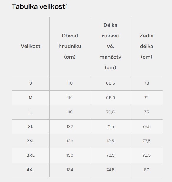 - hlavní materiál: 60 % bavlna, 40 % polyester, doplňkový materiál: 100 % polyester 260 g/m²