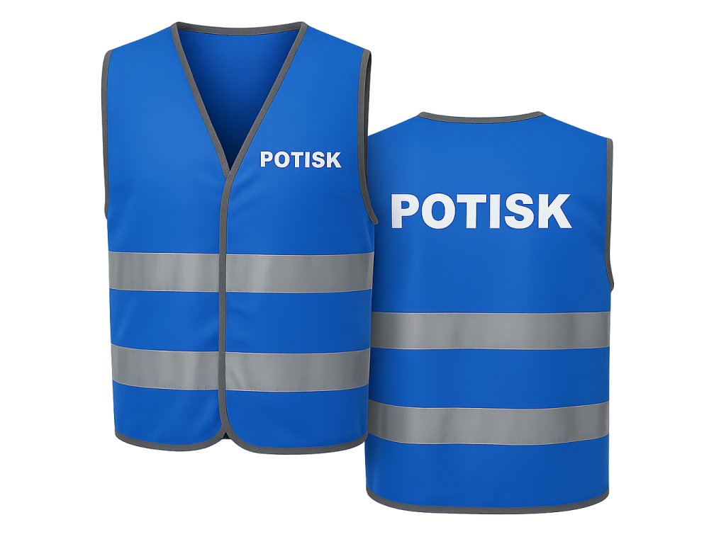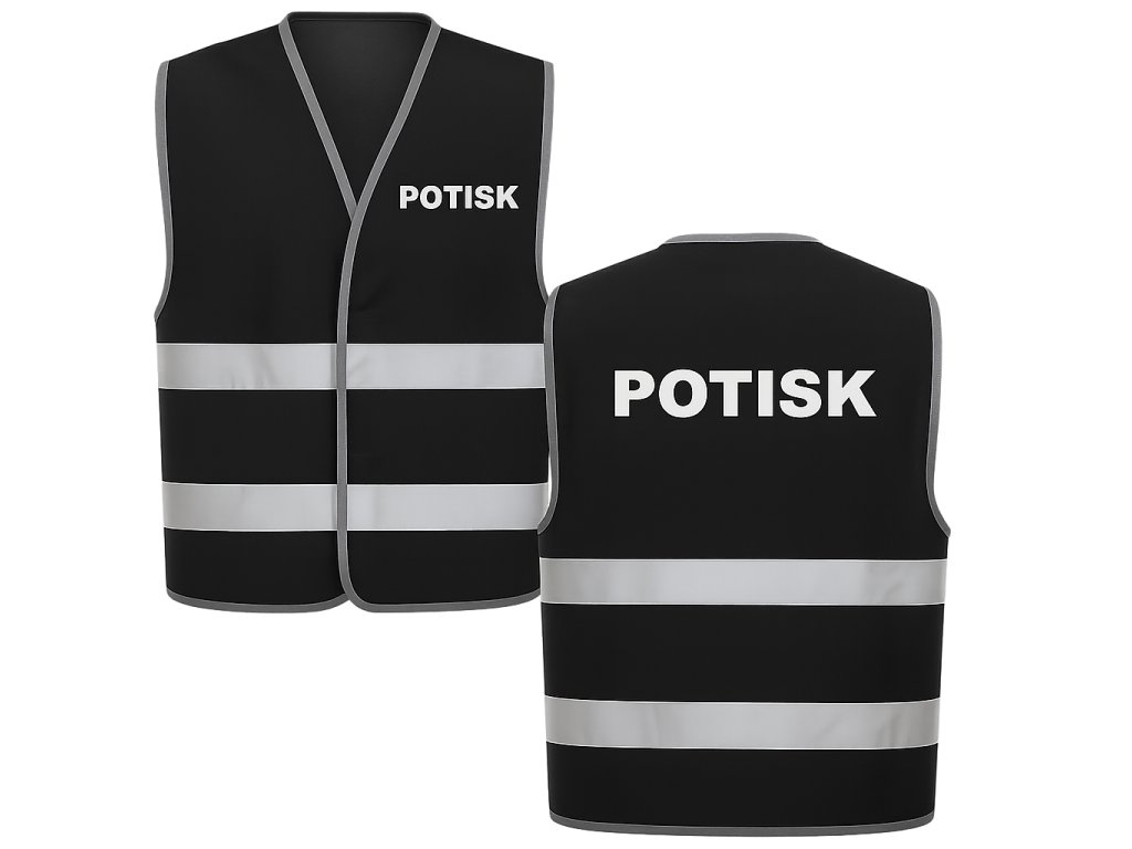 - Přizpůsobení: Potisk o velikosti 29 cm na zádech je zahrnut v ceně vesty. Možnost přidání potisku na levé prso (8 cm) za příplatek.