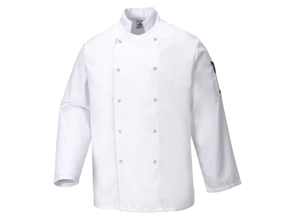 odolný a pevný materiál, pět řad knoflíků, kapsa na rukávu, ideální pro moderní kuchyně