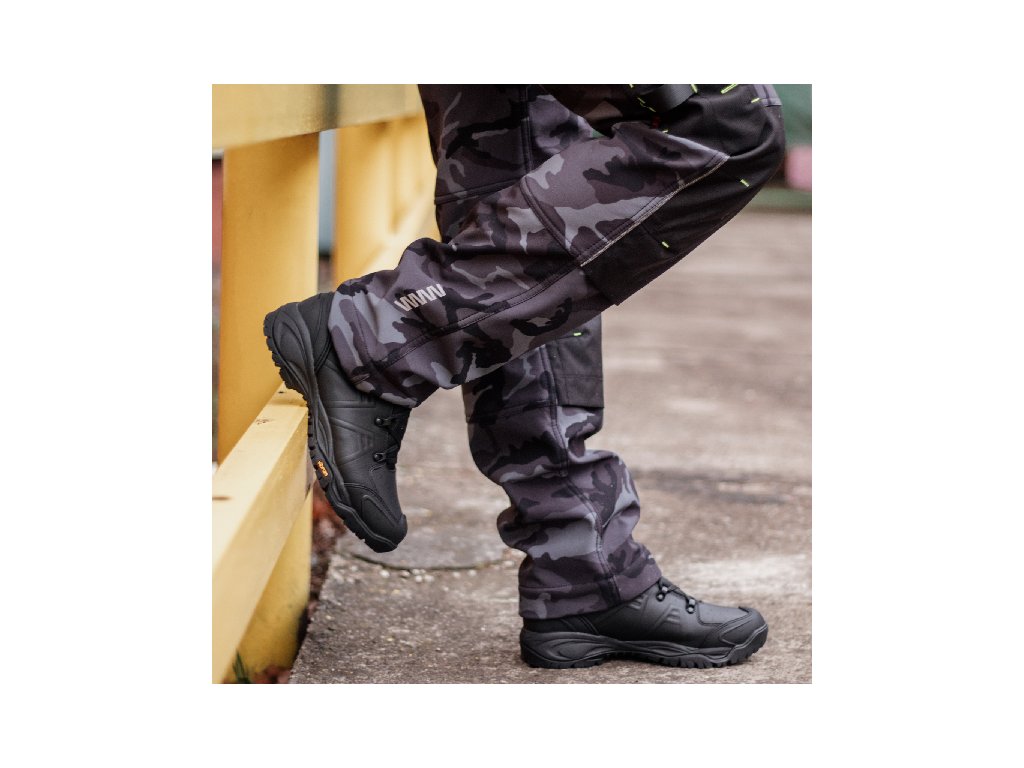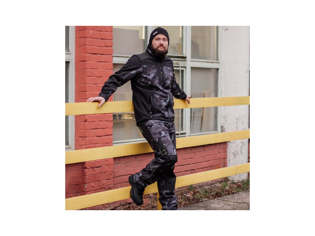 Pružné softshellové pracovní kalhoty s maskáčovým vzorem, vysokou prodyšností a Cordura výztuhami pro práci v chladu.