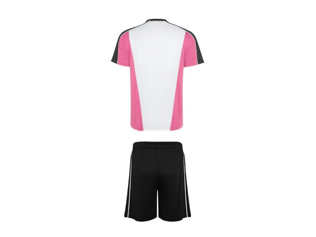 Tričko se šikmými rukávy od krku má lemování na švech pro lepší odolnost a styl. Potisk na přední části dodává setu sportovní charakter a síťovinový panel na zádech zajišťuje optimální prodyšnost. Panel na zádech je záměrně ponechán volný pro vlastní potisk nebo výšivku – ideální pro sportovní týmy a kluby.