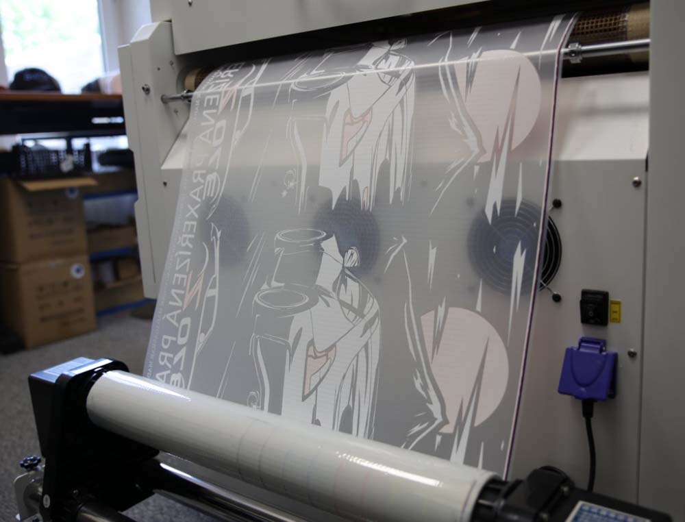 Motiv se natiskne na průhlednou tenkou fólii, která umožní snadné zapasování motivu. Výhodou je omyvatelnost a dlouhodobá životnost motivu. Nicméně i když je fólie hmatem téměř neznatelná, její nevýhodou je i přesto zhoršená prodyšnost textilu pod potiskem.