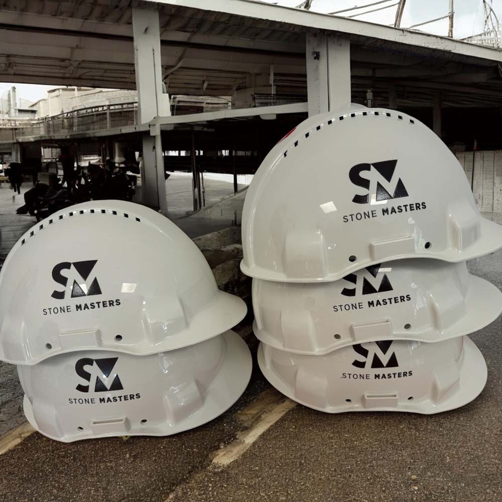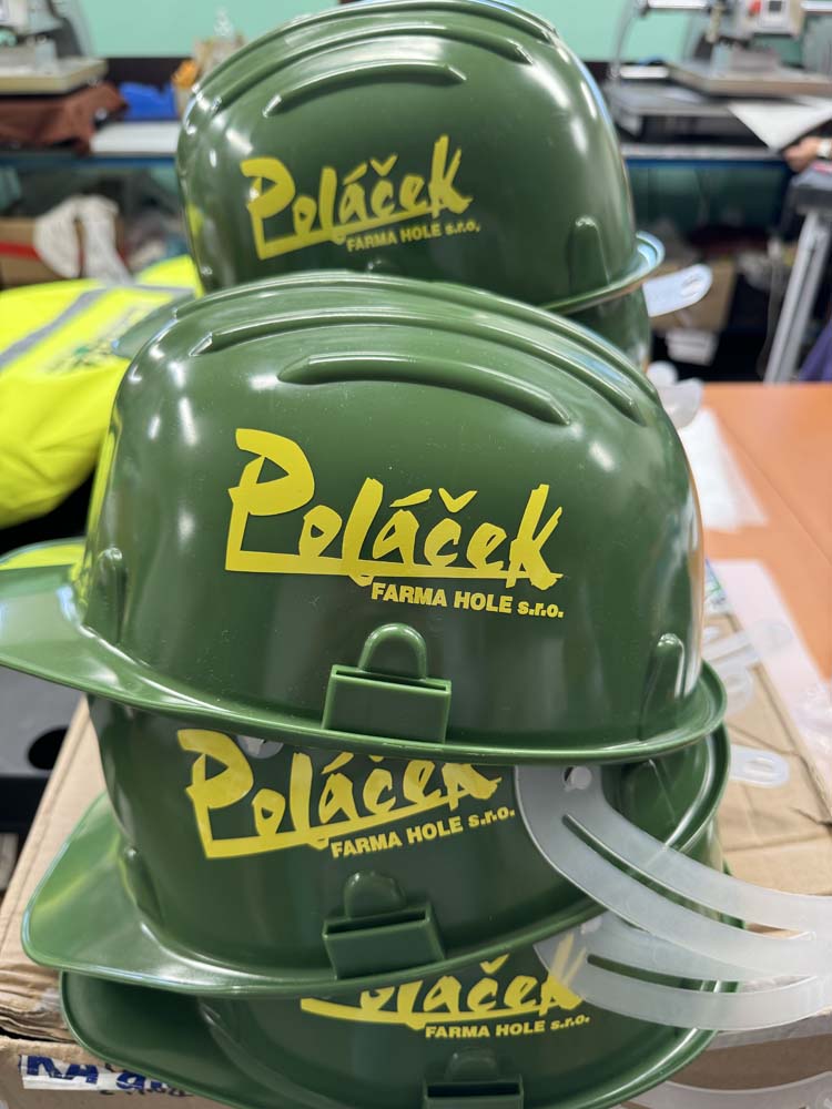 Potisk na ochranné pracovní pomůcky, jako jsou helmy, brýle a speciální textilie, je dalším z našich zaměření. Používáme technologie, které umožňují potisk i na špatně potisknutelné materiály, jako jsou pláštěnky a gumové obleky. Naše metody zajišťují, že potisk je odolný a zachovává svou kvalitu i při náročných pracovních podmínkách.