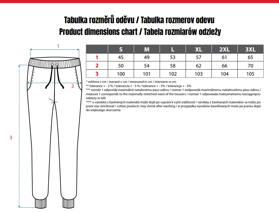 Materiál tvoří směs 65 % bavlny a 35 % polyesteru o gramáži 280 g/m², která zajišťuje příjemný pocit na těle i dostatečnou odolnost. Pas i nohavice jsou zakončeny pružnou žebrovou manžetou, což zvyšuje pohodlí při pohybu. Dvě přední kapsy na zip umožňují bezpečné uložení telefonu nebo klíčů.
